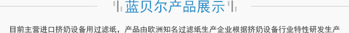 濟(jì)南藍(lán)貝爾工貿(mào)有限公司主要產(chǎn)品擠奶設(shè)備過濾紙,牛奶過濾紙,擠奶機(jī)過濾袋,目前主營進(jìn)口擠奶設(shè)備用過濾紙,產(chǎn)品由歐洲知名過濾紙生產(chǎn)企業(yè)根據(jù)擠奶設(shè)備行業(yè)特性研發(fā)生產(chǎn),產(chǎn)品符合歐盟食品接觸標(biāo)準(zhǔn)及FDA食品接觸標(biāo)準(zhǔn),產(chǎn)品在擠奶設(shè)備過濾紙行業(yè)占有70%以上的份額。并通過了SGS標(biāo)準(zhǔn)技術(shù)檢測(cè)中心按國標(biāo)食品級(jí)標(biāo)準(zhǔn)進(jìn)行的檢測(cè)。產(chǎn)品適用于各種擠奶設(shè)備品牌,本公司目前獲得該區(qū)域產(chǎn)品營銷資格。產(chǎn)品已用于國內(nèi)各大乳企所屬牧...